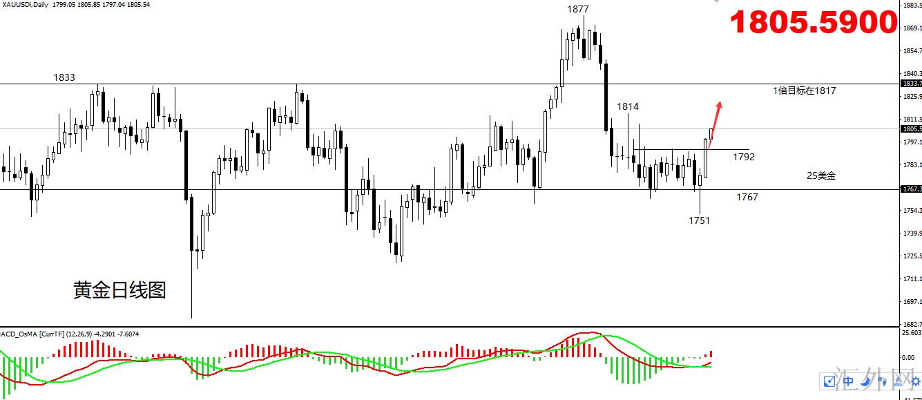 上个交易日,日K线收录一根光头光脚的中阳线,执行了底部击穿的证实动作,击穿1792压力后,意味着底部的形成以及震荡调动的终结,既然底部形成,我们当下需求知道的是形成底部后面,黄金价格的初始上升位置在哪里,依照底部形态来看,从水平支撑到水平压力1767-1792区间有25美金,那么击穿后面1倍量的位置便在1817一线,此位置也是以前在阴跌中多次试探的压力位,预期在此位置左右短线显现调动的几率会偏大些,更深一步压力在1834左右此位置是涨到1877以前多次试探的位置,曾经三次遇阻于此,此位置是当前能目睹较远的上涨位置,至于到这个位置后面是到顶回调,依旧更深一步上升,等到到位置后面再执行分析,短时间内趋势已经明朗。布局层面斟酌低多思路,第一次刷新1817-1820左右可以试图短空,看调动。