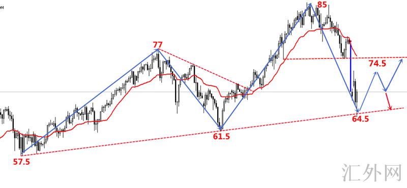 白银前期高点回调到21关键点位进而减轻下跌趋势,随后面临了连阳回弹到25.5左右滞涨,多次打击25.5高点未能击穿,最终面临大幅回调。当前白银遇阻25.5高点又一次跌至21.5前低点置,此波下跌趋势下探强度比较显著!当下白银徘徊22关键点位有希望止跌形成头肩底形态,从整体形态来说左肩位于22关键点位,底部位于21.5名置,当下右肩也是与左肩齐平于22关键点位,而目前右肩位置刚好也是26.8—24.8下探趋势线支撑点,综合上述白银有希望依托21.5双底形态展开回弹,进而形成头肩底反转形态,白银将有希望回弹回涨。当下白银已经显现回弹态势,日K线下探回涨锤子线连阳回弹,布林下缘也缩口往上运行,今日操作上可以在22关键点位布局多单看下回弹,就看涨头是否抓住此救命稻草展开回弹回涨,上方注意23关键点位阻力。