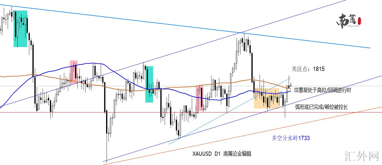 该种收线俗称坟墓星,顾名思义,显现在高低位均为反转信号,黄金周初的波折就比较强了,尽管不会有大涨痛跌,但迈出方向的时间也被拉长。再加之日K中弧形底的右半部分已经构造完成,但触压下挫,弧形底的突破并没有到位,还好有星期四的中阳作为中流砥柱,但是这根烛体也无法抵抗时间的拉长,所以短时间之内,黄金依然需要要迅速上升,给到买方吞没1815/18(时间致使重心偏移),才可迈向下一步的1827/1845。