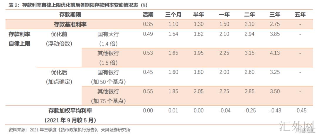 2021年三季度《货币政策实施数据》表示,在今年6月存款利率自律上限优化后,短中期存款利率差不多稳定,长期存款利率显著下滑:9月,新发生定期存款加权平均利率为2.21%,较存款利率自律上限优化前的5月下滑0.28个百分点。其中,2年、3年和5年期定期存款利率较5月分别下滑0.25个、0.43个和0.45个百分点。