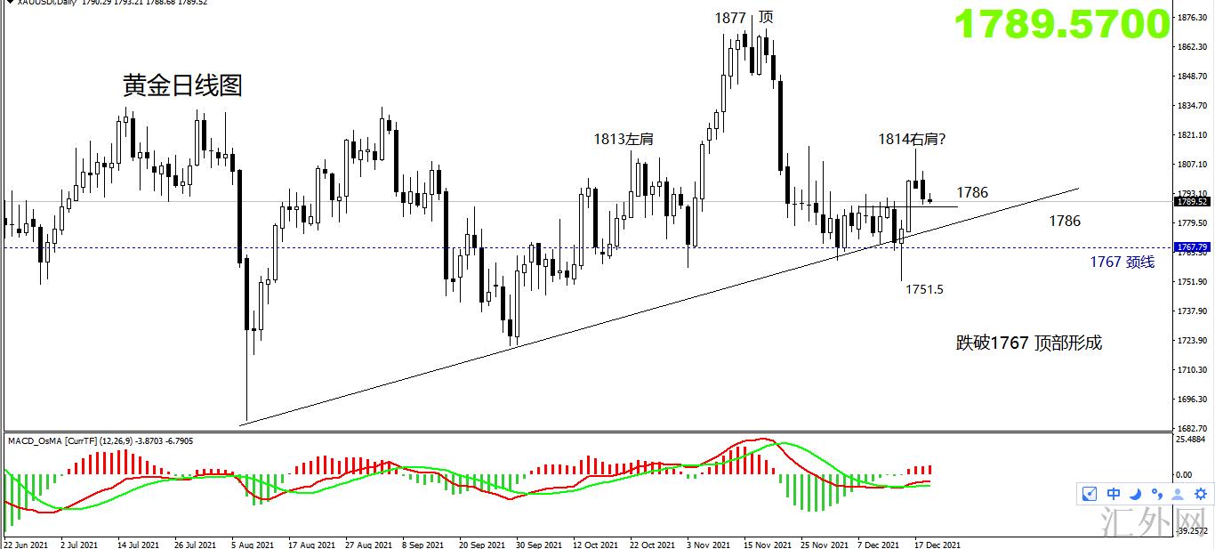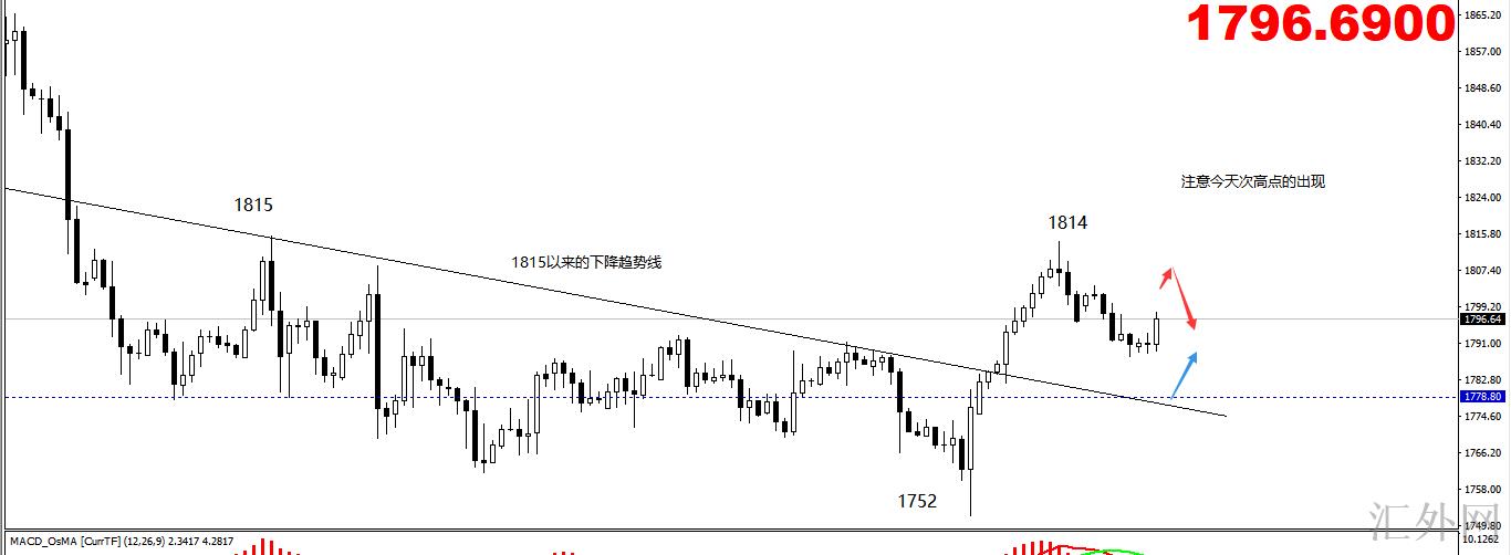 昨天日K线在倒锤线后面收录了一根实体小阴线,确定了我们日K线看震荡的思路,而这根阴线也奠定了日K线的弱势震荡局势,今天日间需求注意1786的得失,此位置是上星期四实体击穿的水准压力,上升的顶底转换位,不错的上涨情形下,此位置最佳不要实体跌穿,跌穿此位置将加大黄金价格下探试探1777上升趋势线支撑的机会,在没有跌穿上升趋势线以前,黄金价格保持保持看多的思路,导致需求注意另一风险,便是当下日K线在走头肩顶形态的机会,而1814便是右肩位置,那么颈线位置在1767,最近一直没破的水准支撑,跌穿颈线1767才可证实顶部的形成,到时也表明黄金价格从1751的回弹终结,所以对于日K线,没有朝下击穿上升趋势线1777以前没买方占领上风,一旦朝下击穿此位置,则注意形成顶部的机会,这个头肩顶形态比较大,所以一旦证实后面,预期会面临单边趋势,以下空间以及下挫强度全将打开。日K线注意1767的得失,此位置是决定卖方以及买方的核心位置。