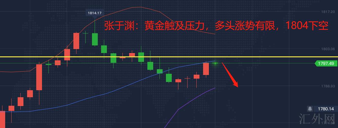 从裸K角度分析,日K线上显著是一种后市看跌的K线组合,所以上升导致回弹。从盘面向上瞧受于四小时接连4根K线没有破低,黄金价格存在往上回弹的需求。同期布林带中轨拦截,买方势弱,卖方必将于美盘发力,将价格压至更小,和昨天一样,1805美元依旧是阻力。从操盘角度去斟酌,黄金价格只要黄金价格不立稳1805美元,就应当乘机买跌。