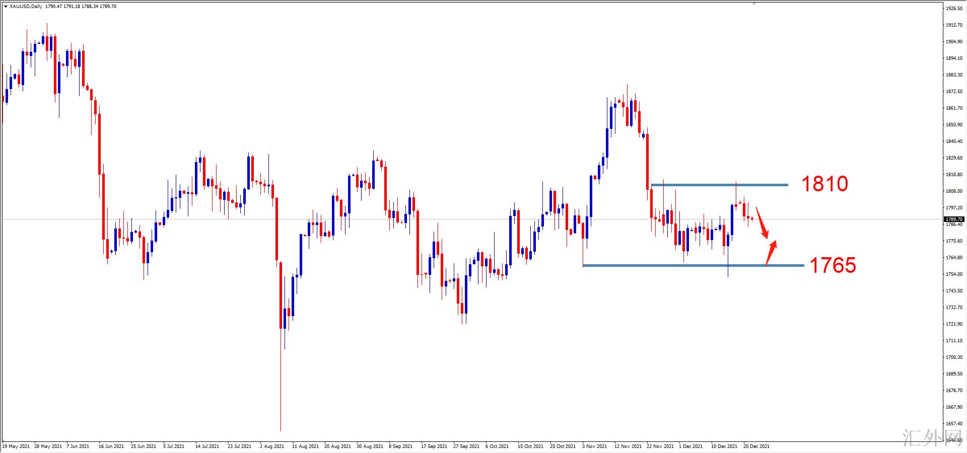 【技术点评】:D1周期表明,黄金处在区间震荡,上方压力下探到1810左右。可斟酌回弹买跌机会。推荐投资人可斟酌1800左右买跌,止损1815左右,止盈1765左右。
