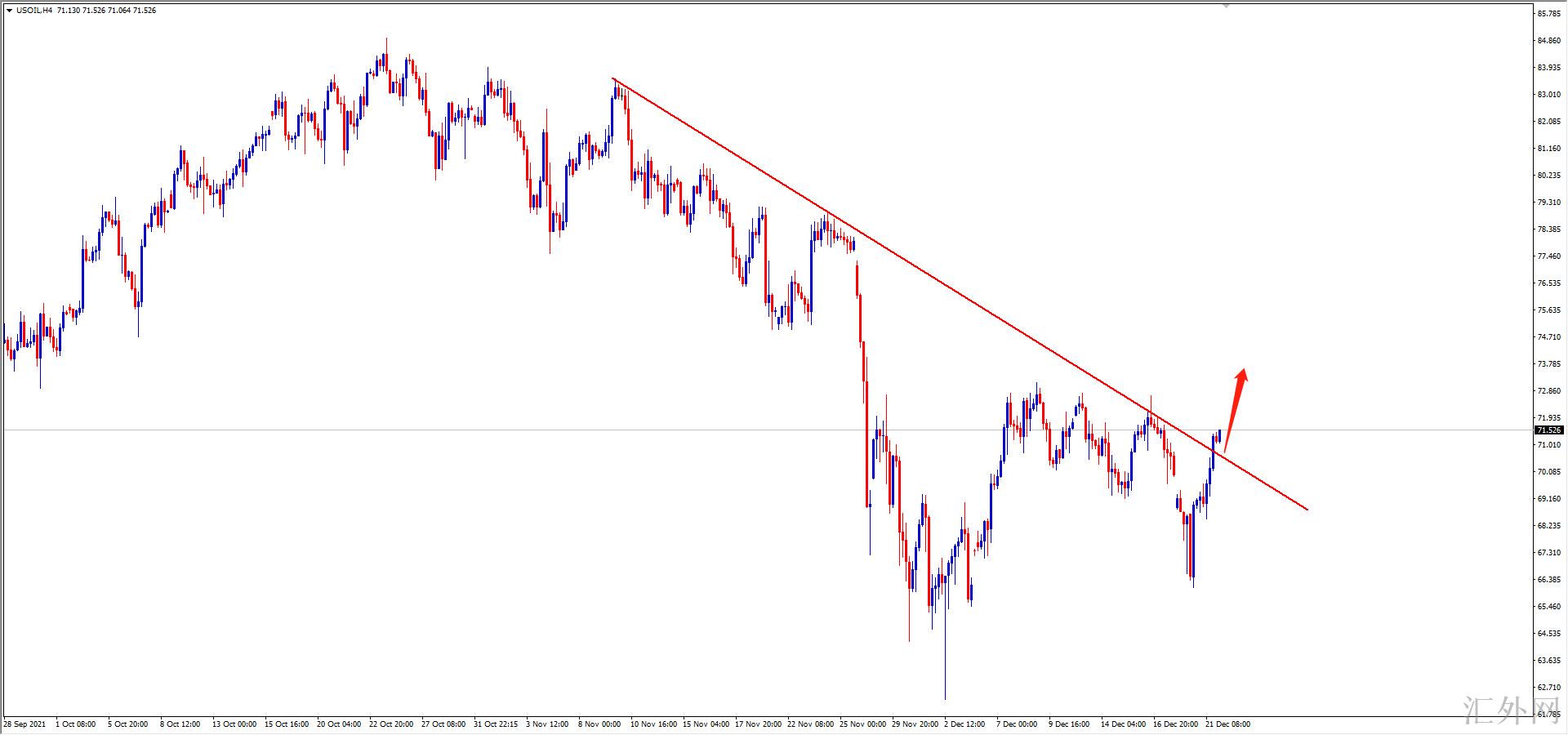 【技术点评】:H4周期表明,原油上破下滑趋势线,卖方有希望终结。推荐投资人可斟酌71.00左右买涨,止损70.00左右,止盈73.00左右。