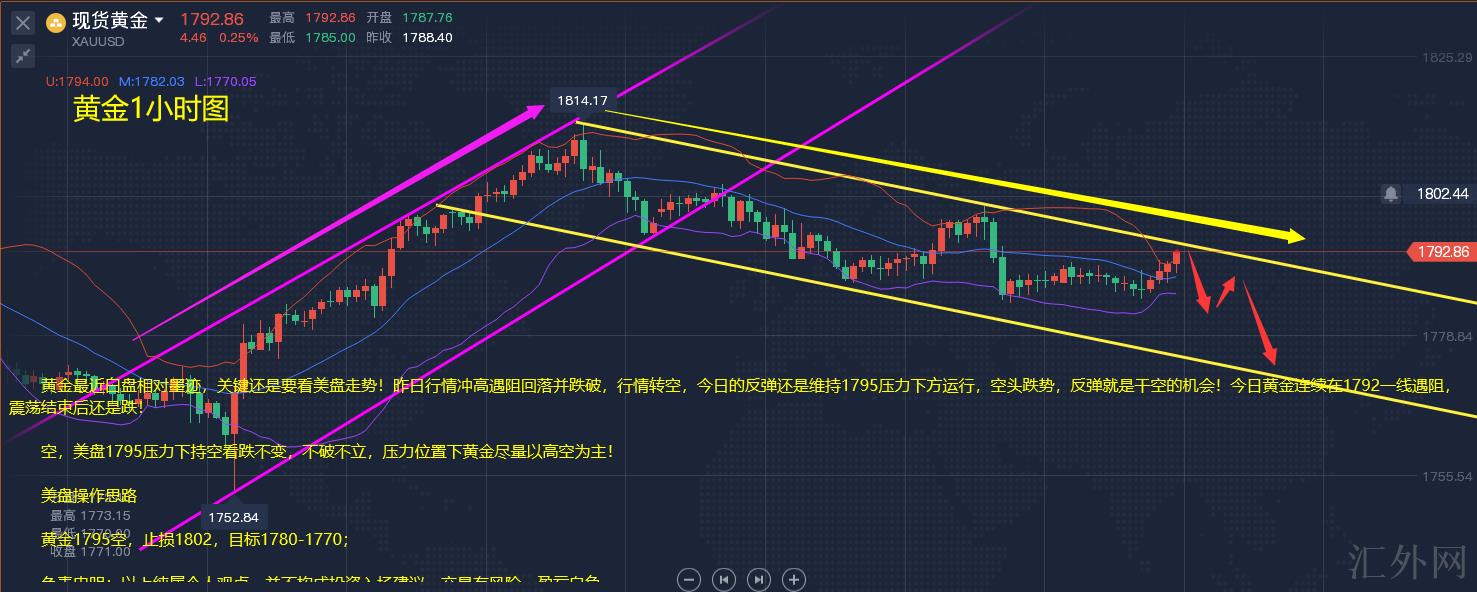 行情回顾:日K线又一次收线上长影线阴线,表明上涨是虚破动作后面依旧形成偏空的下探行情预计,故而短时间依旧维持看弱势保持的态势震荡为主。星期二黄金现货窄幅震荡,欧盘在1800关键点位遇阻,随后适当回调,收盘靠近平盘,报得1789.31美元每盎司;现货白银欧盘大幅上升,收盘吐回部分升幅,收盘上涨1.27%,报得22.51美元每盎司。美元指数在高点震荡,收盘下跌0.091%,报得96.45;10年期美债收益率保持上涨趋势,最多逼差不多1.5%,现回调到1.47%左右。日K线收线决定了后市的预计震荡,行情是强劲的环境中依旧弱势的环境中震荡,当前的盘面依旧是偏空。昨日的行情行情针对性操作层面,首先白盘在没有震荡的同期需求耐心等候,而确立了日间的方向思路,那就应当等候点位,一旦入场较早,那么后市深陷被动的机会性就会放大,昨日的行情亦是这样,尽管看跌保持,但是先回弹那么后市参与的阻力总体较大,会斟酌短时间的回弹会形成保持,而短时间滞涨又一次表明前期的升幅到了当前的阶段告以段落,在弱势趋势的大环境下,回弹依旧显著的行情,回踩都形成了保持,那么依旧弱势回弹后的震荡整理环节。