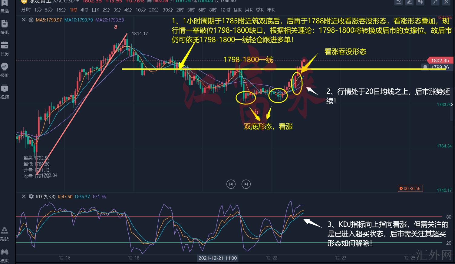 1、1小时周期于1785左右筑双底形态后,后市收一连串的阳线整体显现为震荡上涨,后续于1788左右再收看多吞没形态,看多形态再加上,后市看多。当前行情已突破并立住前市跳开空缺1798-1800一线,依据极性转换原则及跳开空缺一般规则,1798-1800将又一次转换成后市的支持点!小时周期酝酿红三兵形态,日K线周期酝酿上涨三法形态,各周期的裸k信号皆看上升,故后市可依托1798-1800一线轻仓跟进多单,止损1792,计划看到1809-1815-1830!42、1797-1787支撑趋势线的表明:现行情仍位于1797-1787支撑趋势线之上,后市依旧看多!