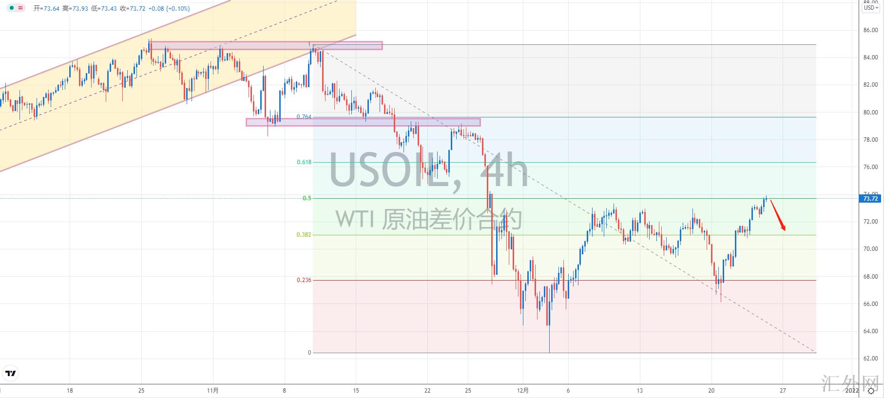 【技术点评】:H4周期,原油摸底回弹,深度回踩,当前价格试探斐波那契50.0%回踩位。