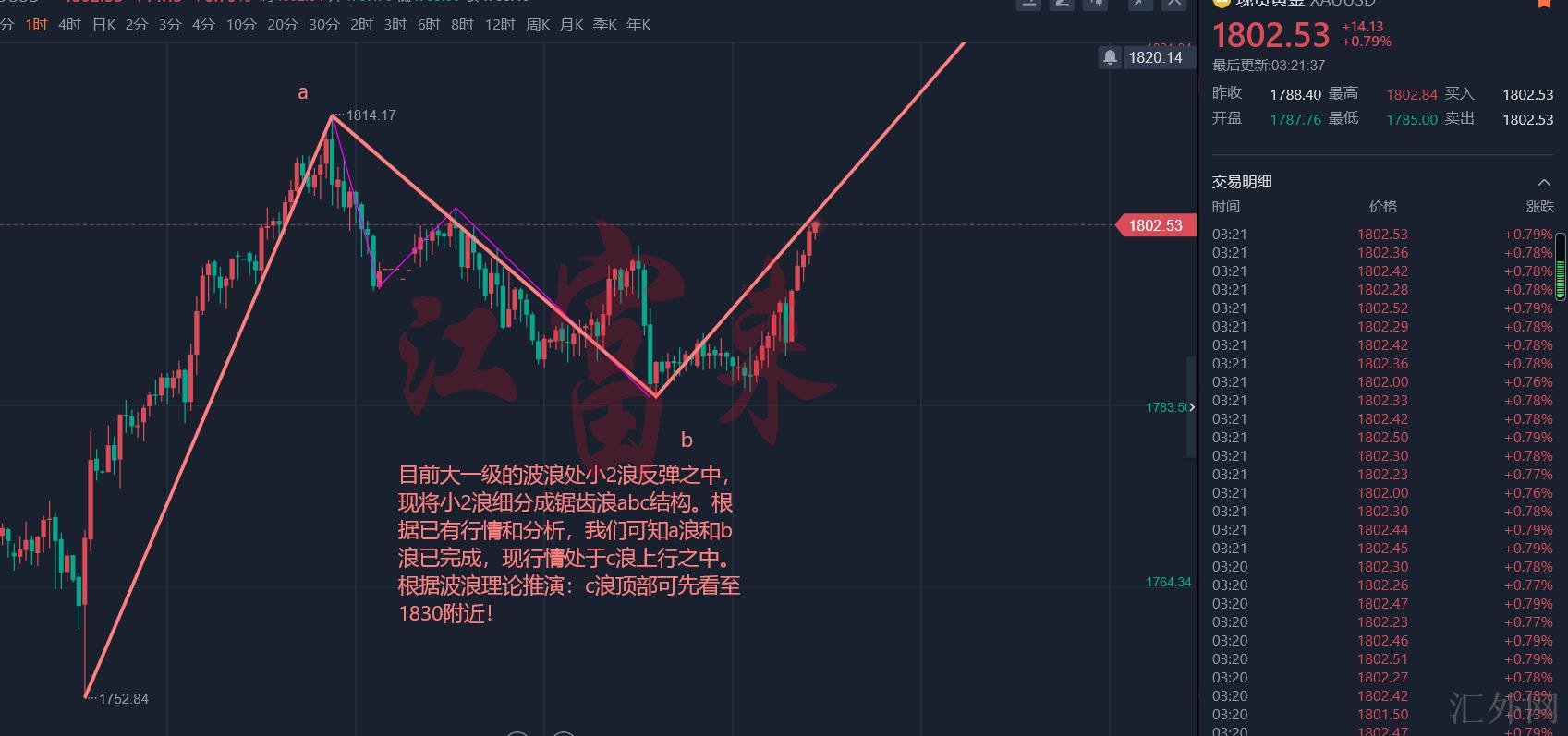 行情按计划回调到1788左右未破1785一线,且往上击穿1798-1800区间,表明b浪回撤已提早终结!行情已步入c浪上涨当中。依据波浪理论推演:C-3-2顶部理论上位于1830左右,故小2浪的细分浪c浪顶部可暂目睹1830左右!