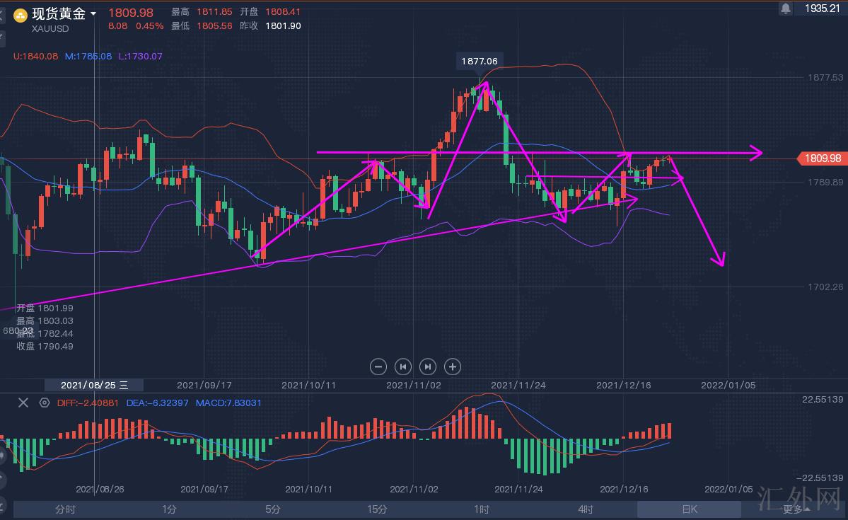 至于通货膨胀、从上半年美联储表明通货膨胀将保持2%附近,到当下为止通货膨胀已经接差不多7%,但是从黄金表现来说金价好像并没有受通货膨胀连续升高助推走高,实质市场就像温水煮青蛙似潜移默化接受高通货膨胀,所以并没有能以高通货膨胀提高市场恐惧情绪。反之伴随美联储逐渐缩紧货币政策,长期行情肯定有好处多头美元助推黄金下探。所以黄金思路无论突破依旧不突破1815任然坚持高空甚至中空布局,假使下挫开放后面或许会朝下击穿前期1680的低位。短时间操作层面黄金依托1815上作为防守1811先空,着重注意1800-1798一线支撑,日间一旦又一次刷新起码可以肯定震荡行情,突破黄金将又一次走弱。
