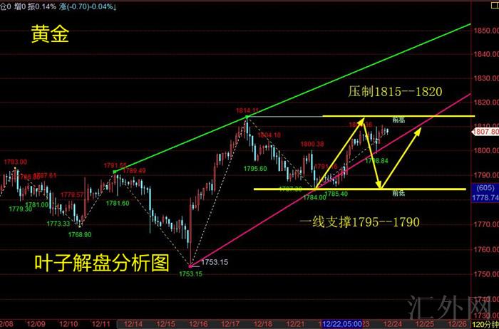 从形态来说黄金依旧属于买方,上周最低回踩到了1785一线,最终收盘又收起来,稳稳收在1800上方,近两周黄金都表现的比较强劲,当前上方抑制位置是1815一线,一旦击穿1815这个位置周线会打开新的上涨空间,这周我们思路依旧以区间操作为主,因节假日的原因我们预期市场的活力不会太大,市场成交量还将降低,来回震荡修复还会保持,修复中的回踩1800-1803一线便是我们买涨的可能。假使1815一线被击穿,我们关注小回踩的可能持续干多单,1795已是新的强支撑点,这带不跌穿差不多都属于买方,再加上最近的基本分析也是支撑黄金买方,俄罗斯和乌克兰的关系紧俏在一定程度上也是支撑黄金买方,今天白盘我们先注意1800-1803一线的多单机会。当前操作具体以本人实时给出策略为准!手里有持仓的朋友可以及时与我沟通交流,叶子为你供应许多操作方案!
