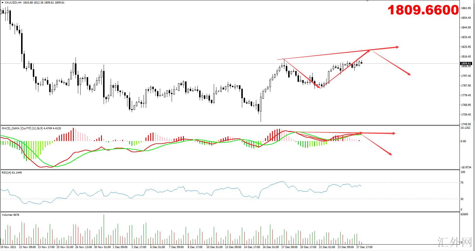 小时级别,昨天说过,小时级别也有机会会迈出顶背离,在1小时和4小时上形成共振的看跌顶背离形态,后面行情开始回调。当前来说,小时级别上冲有了,隔夜最高涨到1813,小时级别的顶背离形态也显现了,但是因为于上冲程度不够,小时级别的顶背离形成了,但是4小时对于高位的需求并没有得到满足,所以4小时顶背离没成立,也就产生了黄金下挫量能不足,而4小时顶背离没成立,还将致使小时级别显现多次背离的情形,所以当前在小时级别上可以目睹黄金已经迈出了二次背离,那么在4小时顶背离显现以前临时不用担忧黄金会大幅的回调,小时级别会多次背离,直到显现高位,4小时顶背离显现后面,小时级别才会迈出较大程度的下探。
