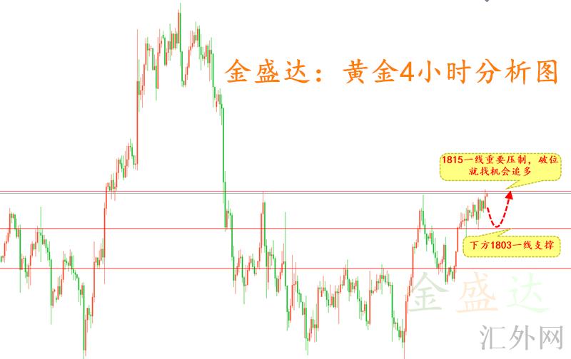 上面分析图是当前的思路,下面重要支撑点我们依旧依托1795,这个位置是1H的支持点,也是形态的支持点置,当前我们注意1803一线的支持带靠近可以布局多单,假使直接击穿了1815一线可以直接追多。当前操作具体以金盛达本人实时给出策略为准!手里有持仓的朋友可以及时与我沟通交流,金盛达为你供应许多操作方案!