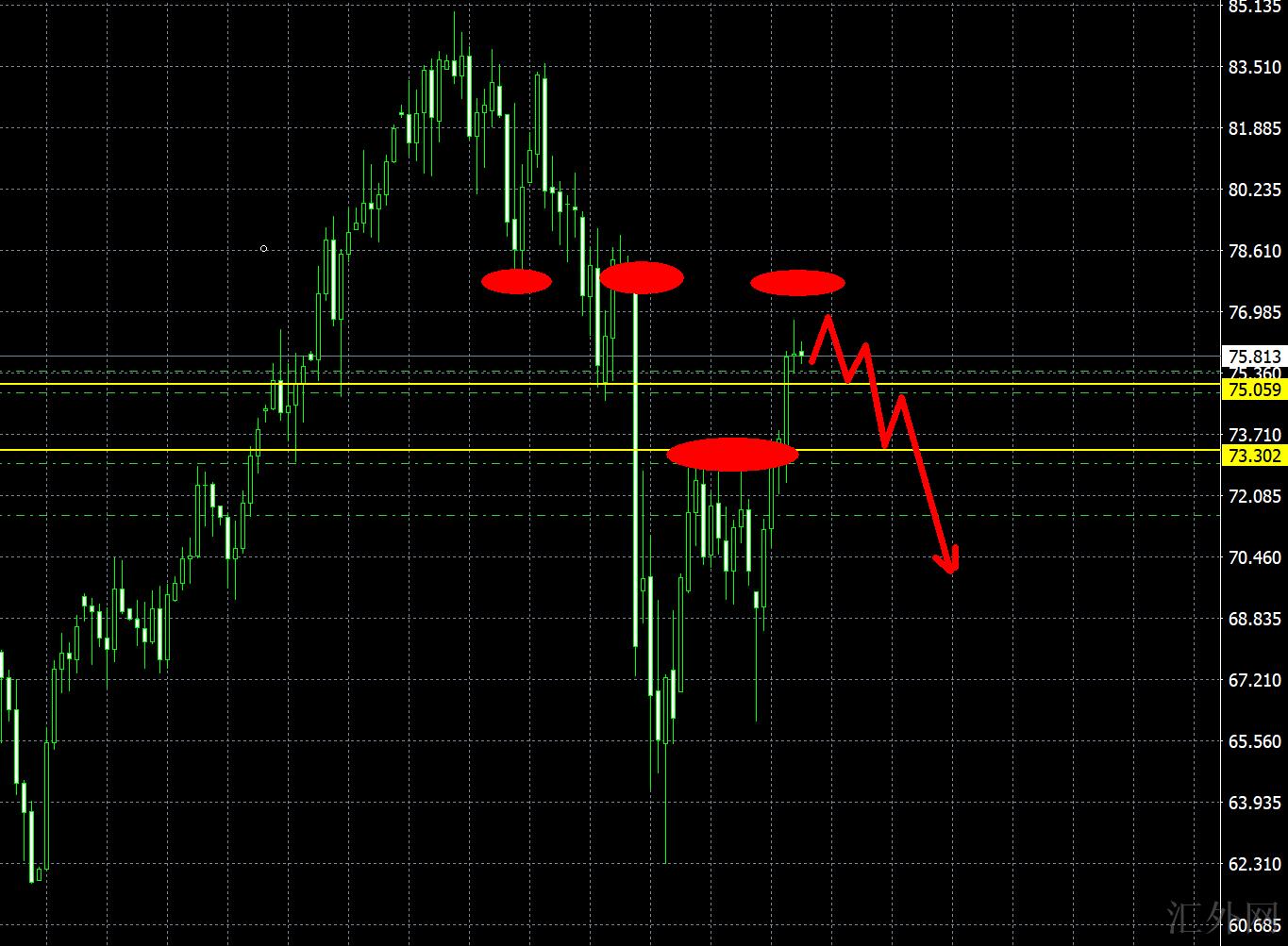 日K线最高刷新到了76.74左右的位置后行情冲顶回调,日K线最终收线在了75.83的位置后,日K线以一根遭遇阻力射击之星形态收线。顾虑到日K线形态的双顶保持,WTI原油后市看跌,第一计划区域75-73第二计划区域 72.3-69.7 第三计划 61-62