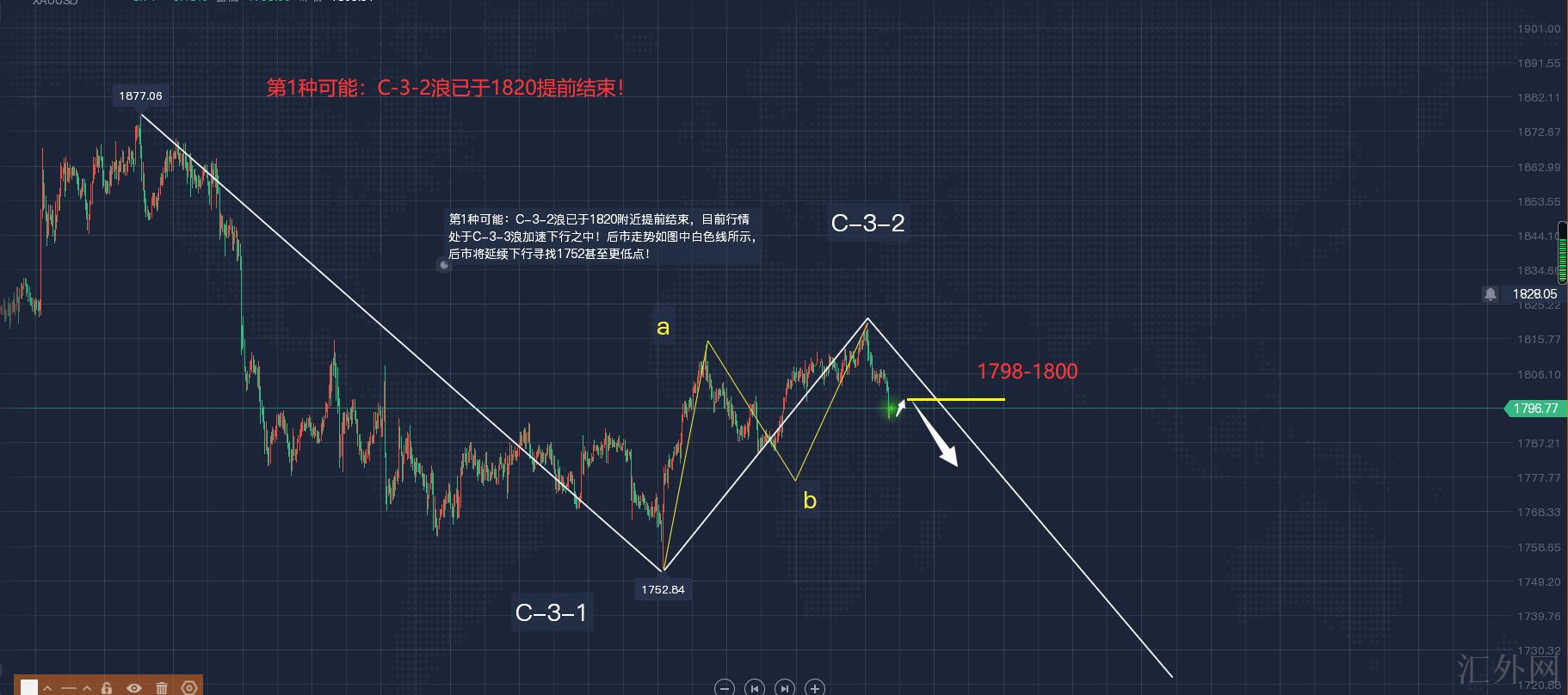 第1种或许:C-3-2浪已于1820左右提早终结,当前行情处在C-3-3浪增速下探当中!后市行情如图中白色线所示,后市将保持下探寻求1752甚至更小点!