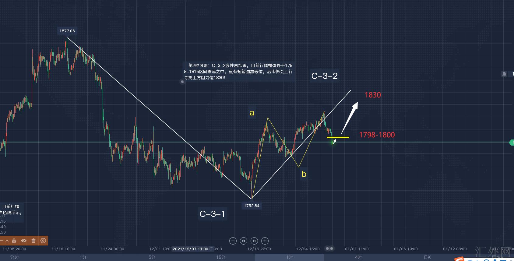 第2种或许:C-3-2浪仍未终结,当前行情整体处在1798-1815区间震荡当中,虽有短暂跨越突破,后市仍会上涨寻求上方压力位1830!
