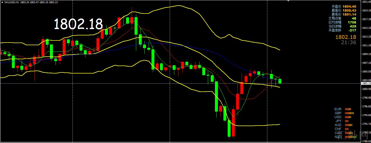昨天黄金价格迈出了先跌后升的局势,盘中最高1807.5,最低1789,收盘以一根带有下影线的十字星线报收盘在1804,符合预计。