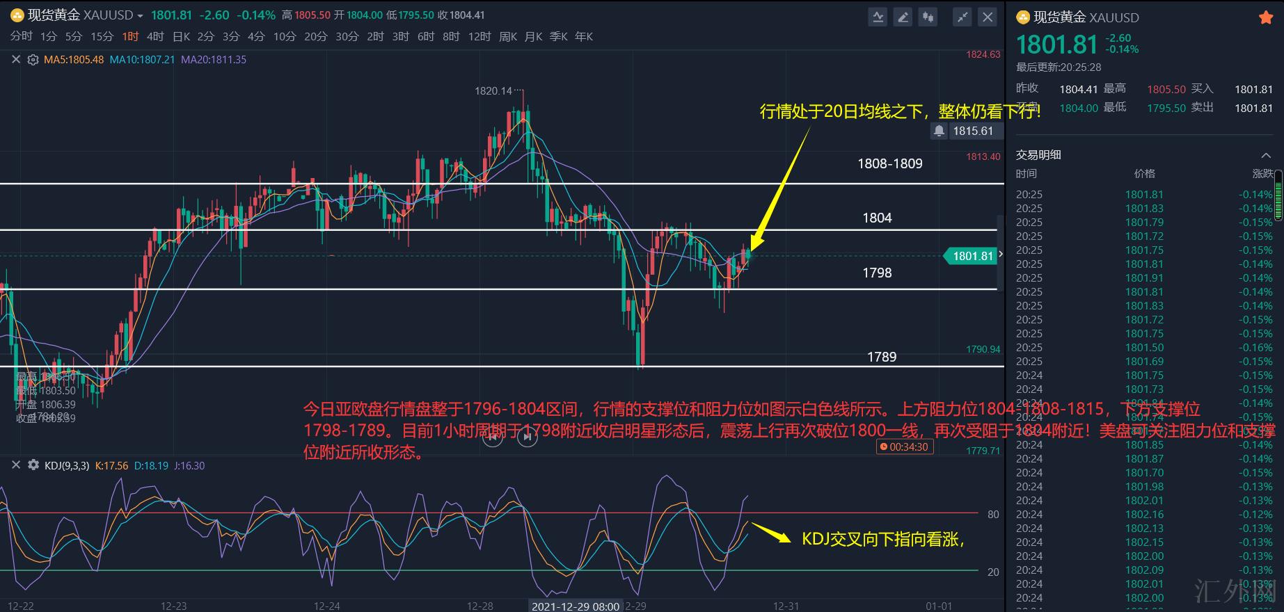1、今日亚欧盘震荡于1796-1804区间,行情虽从新立稳1800一线但未保持上升!美盘我们可从支撑点和压力位左右的形态入手,现行情的压力位和支撑点如图所示。上方注意1804-1808-1815压力位,以下注意1798-1789支撑!