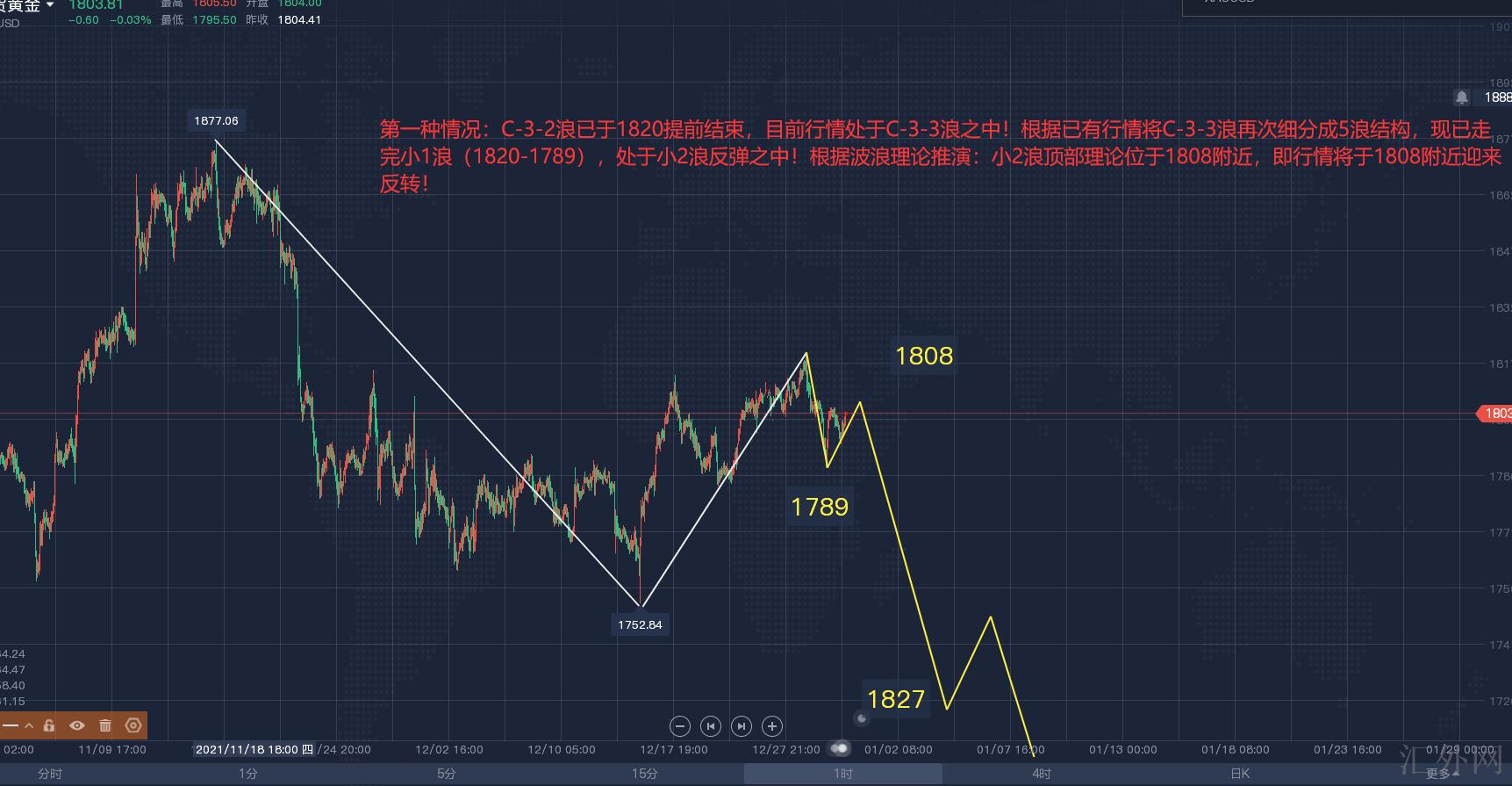 1、C-3-2浪已于1820左右提早终结,现行情处在C-3-3浪增速下探当中。根据现有行情,我们将C-3-3浪细分成5浪结构,如图所示:当前已完成小1浪(1820-1789),现处在2浪回弹当中。依据波浪理论推演:小2浪的顶部理论上位于1808左右(2浪一般回撤1浪的0.618),即后市将在1808左右面临反转!