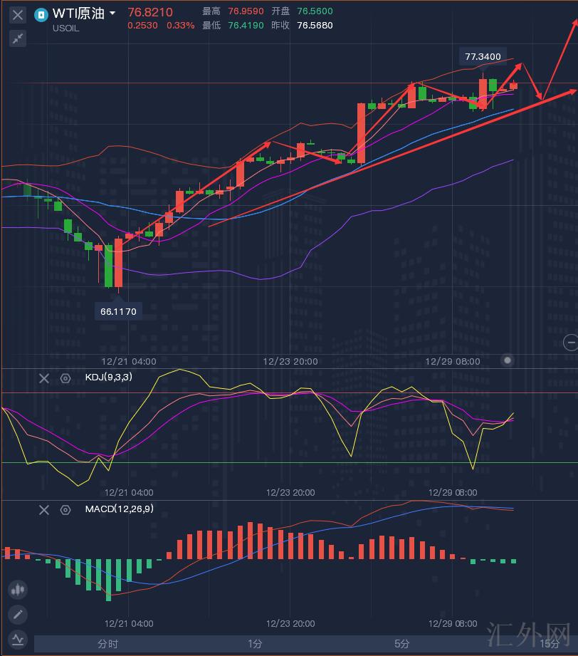 12月30号讯——星期三(12月29号)美元指数下挫,年底市场交投淡静的,除日元外,所有G-10货币兑美元均上升,GBPUSD升到11月19号迄今的最高水平。受美元走跌提升,黄金现货跌穿1790关键点位后大幅回弹,收盘收盘在1805美元左右。原油价格持续上升,WIT原油最多暴涨1.83%,创下11月26号迄今高位到77.37美元每桶;布油盘中刷新80美元关键点位,报告表明,上周WTI原油和成品油库存均下滑,覆盖了对新患者增长或许拉低需求的忧虑。