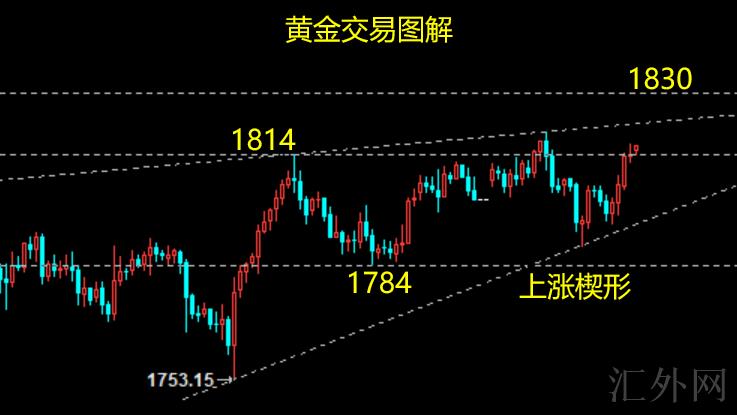 黄金,大趋势接接连分析所述,当前价格处在1877下挫到1753后的回弹周期,首轮上升到1753-1877连线50%节点1814,二轮上升击穿1814到1820后遇阻回撤;星期三价格下探1789后回涨完成修复,文中强调后市可持续看多1814-1820及61.8%节点1830区间;截至当前,已顺遂击穿1814,下一计划点会是1830;