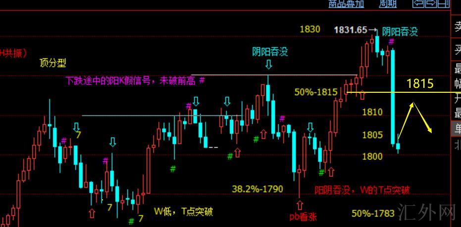 技术分析:黄金一步调动到位直接从1830高点回踩1800关键点位左右,卖方趋势强劲。价格朝下击穿1820意味短时间趋势显现转折,收盘以及明日顺势空为主,阻力1810-1815找机会空。