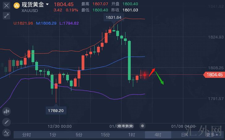 黄金现货星期一(1月3号)早盘开盘之出开盘适当上升,创下日间高点1831.64美元每盎司后展开下探;直至美盘,伴随风险情绪回弹给黄金导致阻力,另外投资人淡化了流行病变种蔓延导致的影响,黄金扩暴降幅,失守1800关键点位位置,创下日间低点1797.57美元每盎司,截至收盘,黄金自日间低点适当回涨,收回1800关键点位位置,收盘在1801.55美元每盎司。