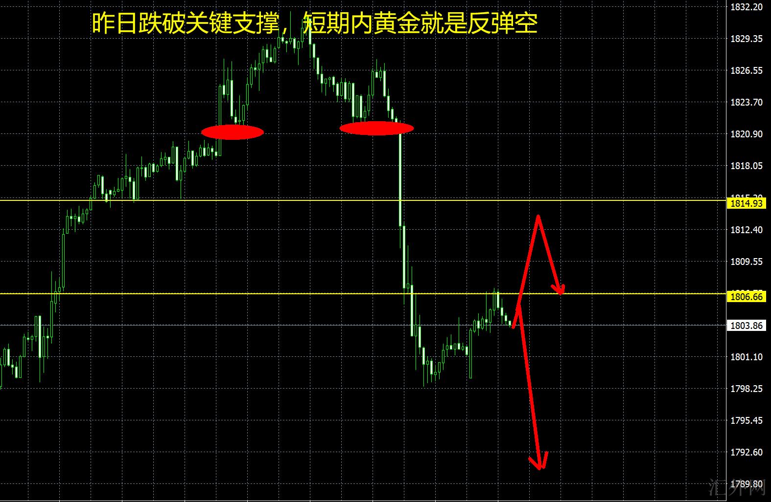 言归正传,今日依照缠论分析。若黄金早盘 欧盘行情环绕在,颈线位1806/7下方运行,那么行情就是 弱势下挫行情。以下可见1792-1784 无意中行情1782 1784一带还将突破。若昨日1799左右成功筑底,欧盘击穿 1806 07立住,那么黄金还会回弹。这时黄金就是走震荡行情。1820-1800 这是区间。该种情形依旧不是看暴涨,导致回弹。