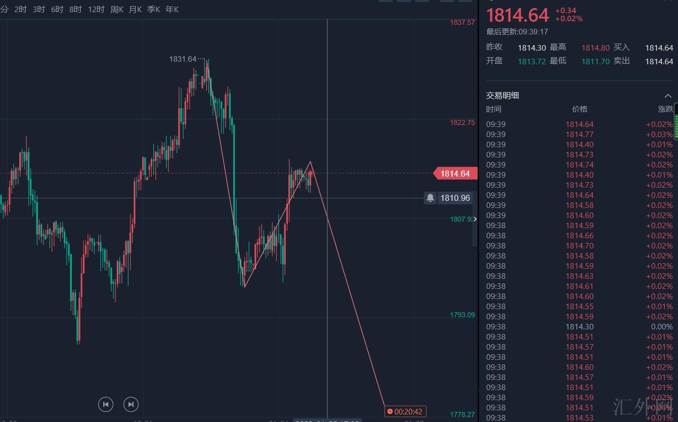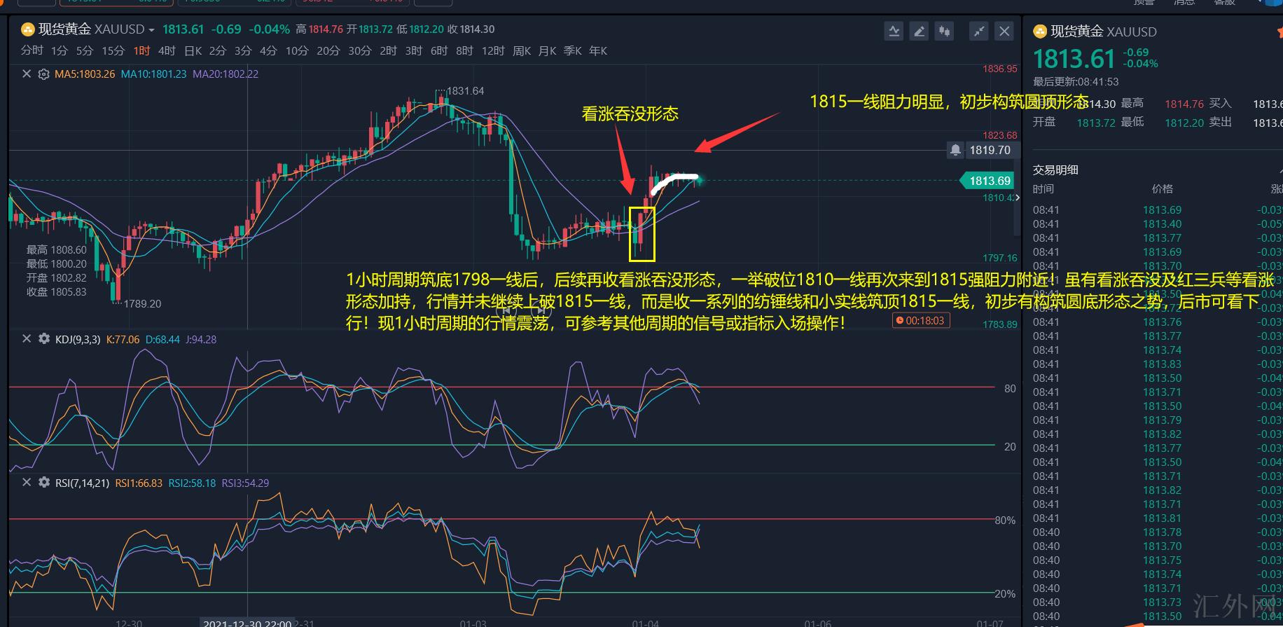 1、1小时周期筑底1798一线后,后于1798左右再收看多吞没形态,一举击穿1810一线又一次上升到1815强压力左右!现行情虽有看多吞没形态和红三兵看多形态加持,但仍未持续往上击穿1815一线持续寻求上方压力1830,而是收一连串的纺锤线和小实线筑顶1815,初始有构筑圆顶形态之势,后市看下探!1小时周期局部仍未见显著信号,短线操作可参考其余周期信号和指标入场!