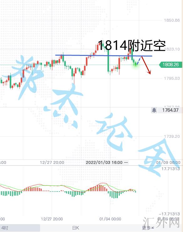 技术分析来说,黄金昨日暴涨后再遇阻回调,实盘黄金空单进场略早,止损后就回调下探。亚盘黄金再1810左右震荡,后续下挫并没有显著,但当前是跌穿4小时周期中轨,短线行情依旧偏空,所以今天早盘黄金思路就很简单,先看调动,预期是在4小时中轨1813-1815这里持续买跌看空,以下支撑持续关注日K线中轨1798,不破1798,黄金依旧可以看多。