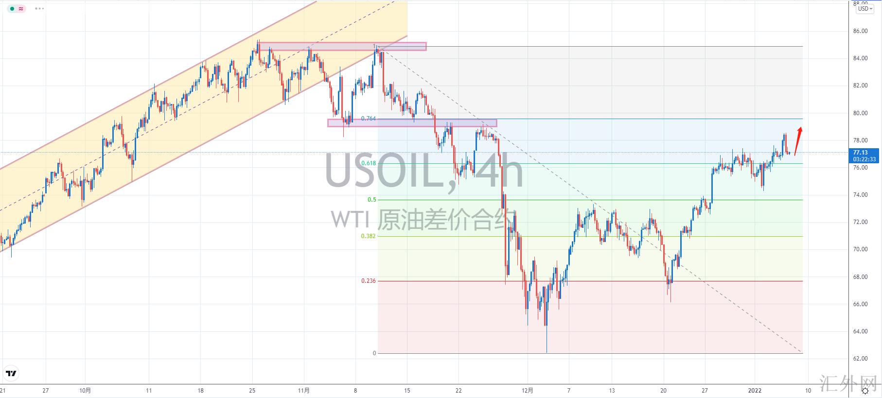 【技术点评】:H4周期,原油摸底回弹,深度回踩,当前价格击穿斐波那契61.8%回踩位。