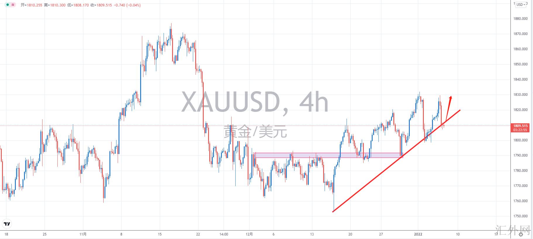 【技术点评】:H4周期,黄金沿上涨趋势线稳健爬升,周内大约率持续上涨。