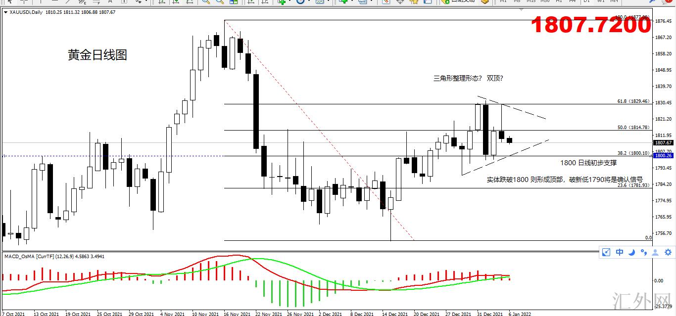 日K线注意今天阴线的保持性,核心支撑在1800,此位置的得失用来证实黄金价格是顶部形态依旧上升中继。