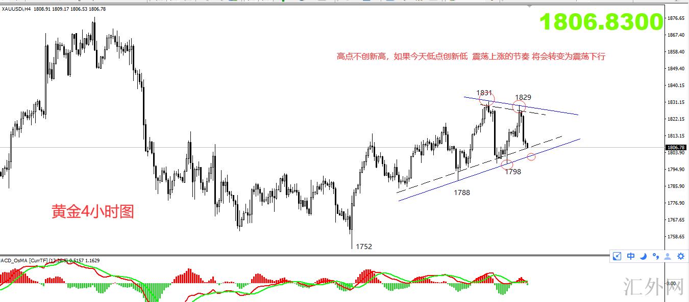 短线4小时层面,昨天回弹高位没攀高峰,依照k线形态来看,更贴近三角形整理形态,三角形下缘支撑在1801,此位置也是日K线的共振支撑,日间刷新此位置可以斟酌多单,需求注意 的是,三角形形态想要保持,需求显现高位下探,低位抬高,受于昨天没攀高峰,今天一旦显现低位破新低,即破前面起涨点1798,那么表明三角形突破,以及以前震荡上涨的节奏转变为了震荡下探,到时需求注意黄金价格下探试探1788以及1785的机会。
