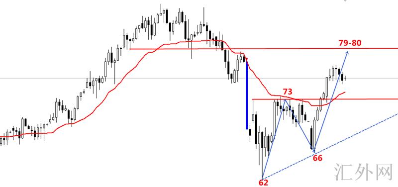 原油前期冲顶85关键点位崩盘回调,直接从78痛跌到62名置得以止跌,而且以锤子线收尾面临强劲回弹回涨击穿70关键点位,代表62关键点位有大批做多盘支撑。最近遇阻73关键点位回调试探66低点后买方又一次扬帆起航。日K线面临六连阳上升,而且成功击穿73关键点位到80左右,原油峰回路转表现的相当强势。当下80关键点位是着重,若是又一次击穿那么也会试探85这个年度高点阻力区,甚至有希望击穿再创下高。毕竟目前日K线连阳上升,布林带也开始往上开口运行,MA5—MA10均线金叉态势,周线也是连阳上升,所以操作上维持回踩入多为主,回踩77左右多,可以在80关键点位博下回踩。