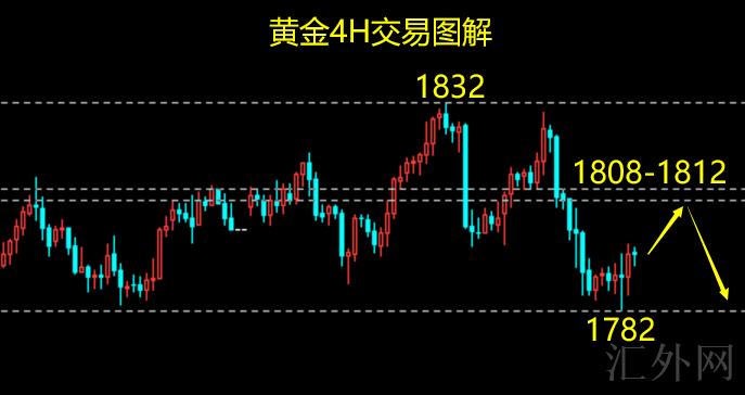 星期五非农就业报告有好处多头,价格在抵达1782后回弹回涨,日线图收阳,短时间仍有上升量能;中期在1782-1832连线61.8%节点1812往上击穿前,仍处在卖方趋势;且市场情绪受加息有好处空头统治,预计下周在完成回弹修复后会又一次下探1782低点;