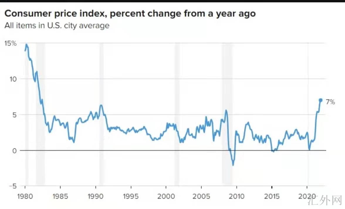 美国劳工部星期三公布的报告表明,美国12月消费者物价指数(CPI)同比上升7%,好于11月的6.8%,为1982年迄今最快增速,也是通货膨胀率接连第三个月胜过6%。12月CPI环比则上升0.5%,经济专家在此之前预期,美国12月CPI同比涨7%,环比涨0.4%。