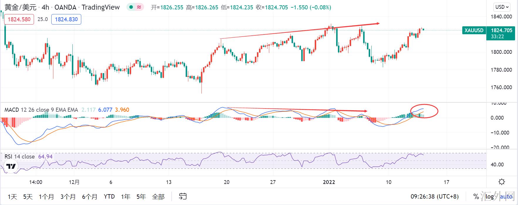 黄金经历星期二的上涨后面,以前预计的黄金低点震荡调动后面持续回调也就不存在了,昨天看黄金短线持续上升,给出的推荐是寻求接多机会短线买涨,然而黄金隔夜回调的程度的确是太小了点,连1810都没能刷新到,小时级别迈出了顶背离形态,这和以前4小时级别走顶背离是一样的,然而以前看的是4小时顶背离和日K线快慢线的萎缩粘合,当下看的是小时级别的顶背离和4小时快慢线的萎缩粘合,这表明什么?表明黄金震荡的周期越来越短,震荡的程度还将越来越小了。