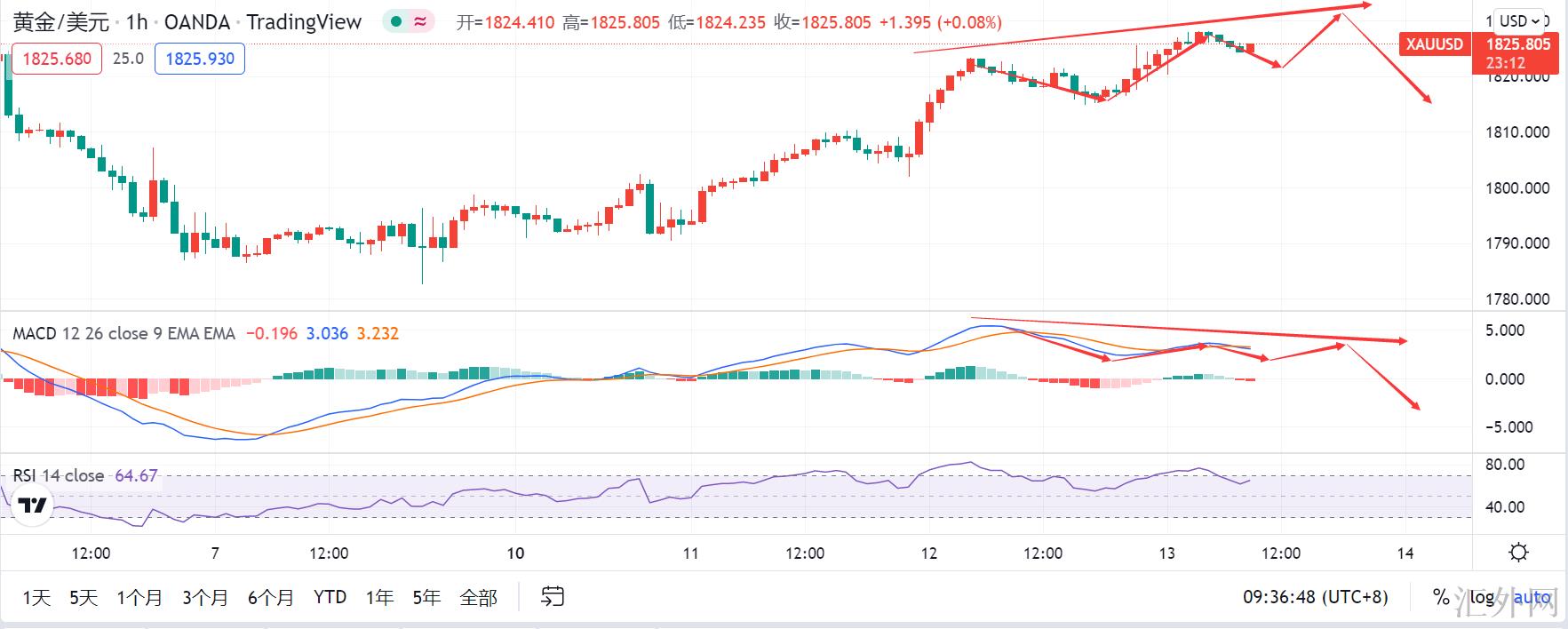 再来说小时级别,上边说过了,当前黄金4小时级别快慢线的发散程度和在此之前日K线快慢线很像,那当下再看看小时级别和第一幅图中4小时行情像不像?4小时上,黄金迈出了三次顶背离后面,黄金开始朝下回调,当前小时级别上黄金也迈出了一次顶背离,而且已经从高点开始回调了,预期日间适当回调后面,黄金会面临下一次冲顶,在小时级别上迈出二次顶背离。