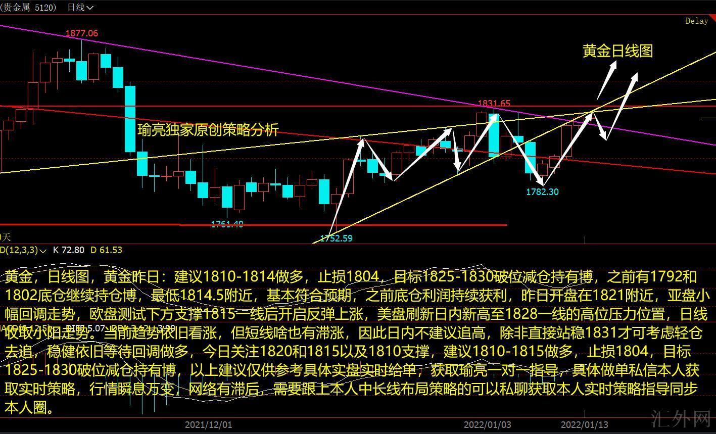 黄金,日K图,黄金昨日:推荐1810-1814买涨,止损1804,计划1825-1830突破减仓持有博,以前有1792和1802底仓持续持仓博,最低1814.5左右,差不多符合预计,以前底仓利润连续获利,昨日开盘在1821左右,早盘适当回踩行情,欧盘试探以下支撑1815一线后开放回弹上升,美盘创下日间高峰到1828一线的高点阻力位置,日K线收取小阳行情。目前趋势依旧看多,但短线啥也有滞涨,所以日间不提倡追涨,除非直接立住1831才可斟酌轻仓去追,稳健依旧等候回踩买涨,今日注意1820和1815以及1810支撑,推荐1810-1815买涨,止损1804,计划1825-1830突破减仓持有博,以上推荐仅供参考具体实盘实时给单,获取瑜亮一对一指导,具体做单私信本人获取实时策略,行情瞬息万变,网络有落后,需求跟上本人中长线布局策略的可以私聊获取本人实时策略指导同步本人圈。