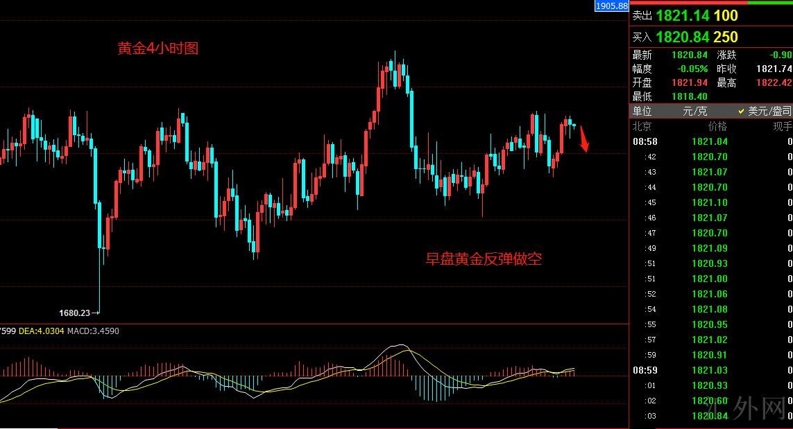 星期四黄金先跌后后涨,日K线在1830左右收带下影线的阴线,这显示黄金多空焦灼,假使是卖方,阴线应当是大阴,假使是买方才会如此收线,不管趋势如何,今天早间我们黄金依旧先布局黄金的空单,底部布局黄金的多单,4小时图看能不能收阴,收阴的话,表明黄金开始下挫,亚盘黄金上方注意1822左右的抑制,一般开盘的高位代表上方短时间的阻力,未破的话,黄金会下挫一次,或者说黄金震荡横盘。