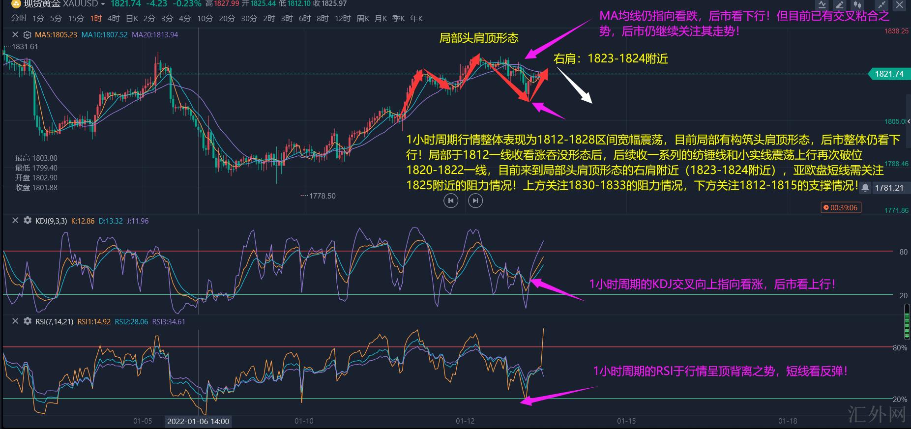 1、1小时周期行情整体显现为1812-1828区间宽幅震荡,当前局部有构筑头肩顶形态,后市整体仍看下探!局部于1812一线收看多吞没形态后,后续收一连串的纺锤线和小实线震荡上涨又一次突破1820-1822一线,当前到达局部头肩顶形态的右肩左右(1823-1824左右),亚欧盘短线需注意1825左右的压力情形!由于上方1830-1833强阻,推荐今日亚欧横盘体仍以高空为主!上方注意1830-1833的压力情形,以下注意1812-1815的支持情形!