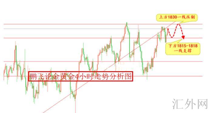 从4小时看显著的顶部结构,三重顶尤其显著,大阴线连续下探,同期也是头肩顶的结构,该种高位持续的在减弱,两点一线显然是朝下倾斜,以下支撑点持续看1808-1810一线,黄金又一次被打压,保持1830一线以下空不改,除非立住该压力位,综合来说下周黄金操作上鹏飞论金推荐回弹布局空单为主,上方注意18301828一线抑制,以下注意1805-1810一线支撑当前操作具体以鹏飞论金本人实时给出策略为准!手里有持仓的朋友可以及时与我沟通交流,鹏飞论金为你供应许多操作方案!
