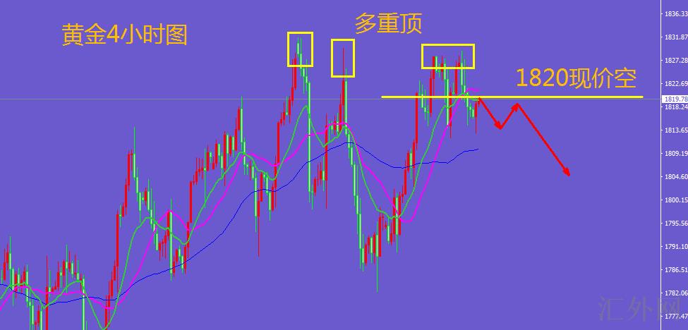 4小时图中,多重顶形态,市场已经给了一个清晰的信号买跌,现价直接进场,单子下去必是利润,1830以下大胆进场空单,没有大的市场新闻刺激,金子是很难击穿1830压力,顶部反转,回弹就是给进场空的可能,不敢上车源自于本身的不自信,所以在一次次的错失机会中懊悔,金金空单已进,等候欧盘收割,以下1805依旧是看跌的计划位,坐等卖方归来!