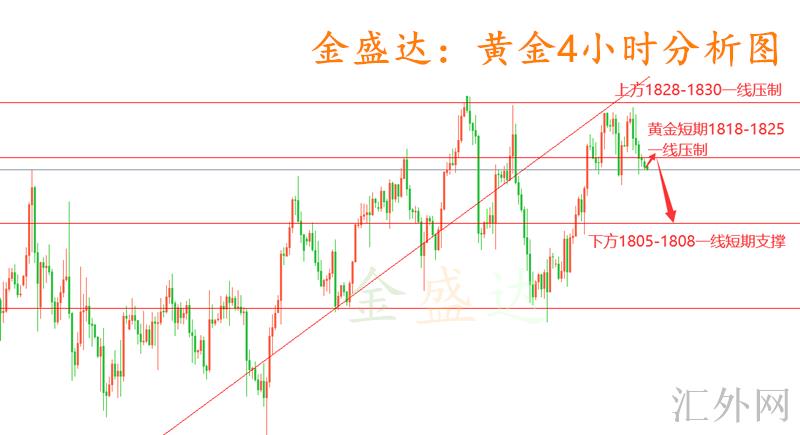 从4小时看显著的顶部结构,三重顶尤其显著,大阴线连续下探,同期也是头肩顶的结构,该种高位持续的在减弱,两点一线显然是朝下倾斜,以下支撑点持续看1808-1810一线,黄金又一次被打压,保持1830一线以下空不改,除非立住该压力位,综合来说,当前黄金操作上金盛达推荐回弹布局空单为主,上方注意1830-1828一线抑制,以下注意1805-1810一线支撑当前操作具体以金盛达本人实时给出策略为准!手里有持仓的朋友可以及时与我沟通交流,金盛达为你供应许多操作方案!