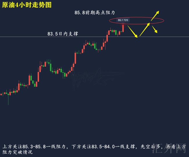 原油技术分析来分析,日K线上,隔日原油持于上缘MA5日移动均线之间交投,同期上演冲顶回调摸底回涨,但仍报得小阴十字星,日K线上,今日原油开盘上升,但仍未打破前期高位85.4左右,仍有回调需求;4小时上,隔日原油开盘适当上升后一阳一阴展开下探,并在跌穿MA10日移动均线后展开回涨,目前布林带处在开口期,MA均线三线往上,KDJ随机指标三线往上,到达超买,MACD指标红色量能柱连续放量,快慢线拐头往上,综合来说,原油早间经历上升,短时间或上涨趋势不足,日间交易参考先空后多,上方注意85.3-85.8一线压力,以下注意83.5-84.0一线支撑。