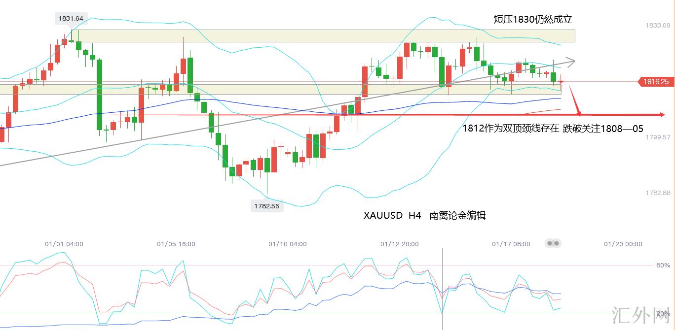 1812一带作为短线区间下缘,需注意当行情跌落影线密集区后,支撑更深一步下探到1808—1805区间。诚然,短线上依然没有逃脱震荡结构,越接差不多1800越可试图介入多单。原因嘛,跟亚盘判定诱多统一,没有强劲抑制的行情就像一团散沙,都不用风吹,走两步就散了。要想黄金走巨幅抛压,上面大周期已经给了最好提示,假使你不听,那我也拦不住,只能说加油了。
