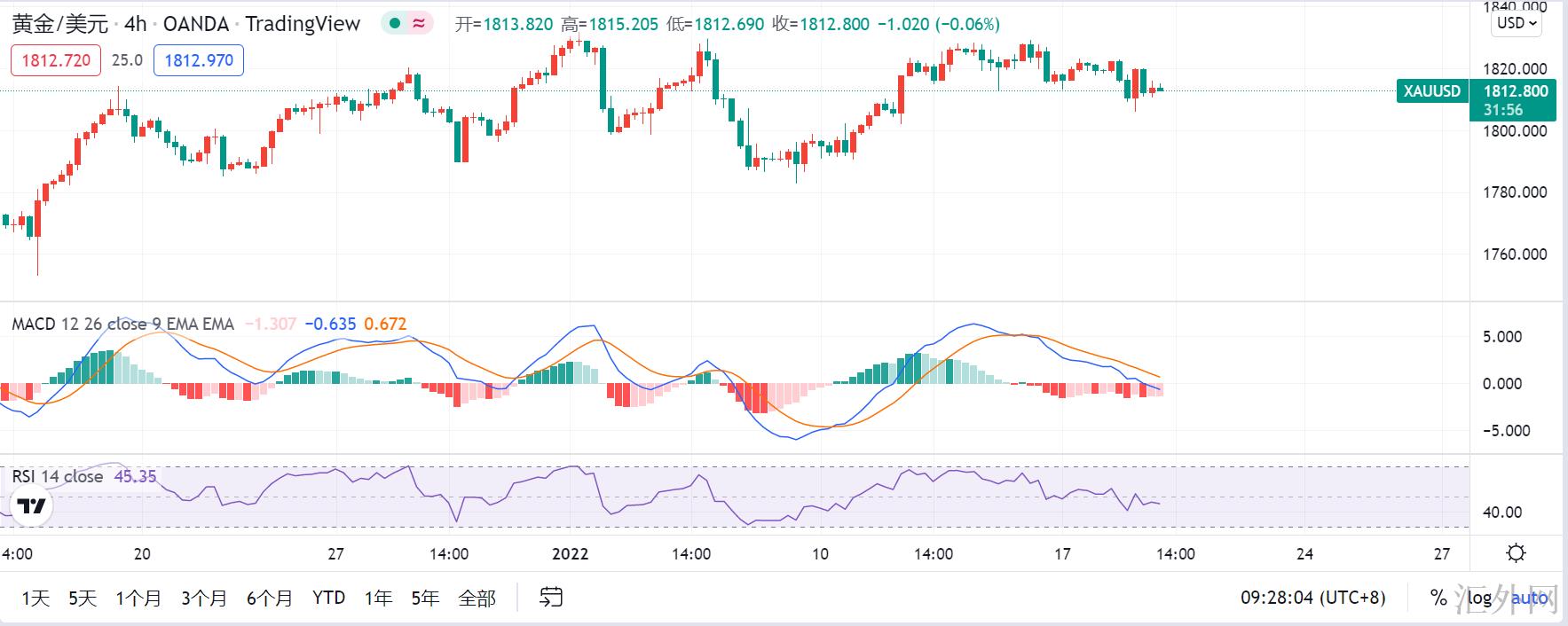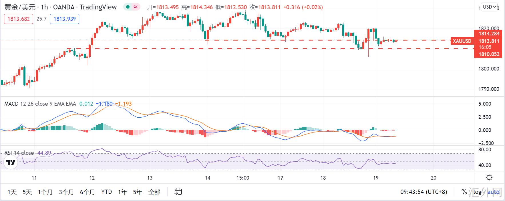 日间操作上,假使黄金4小时级别的MACD快慢线在0轴上方萎缩粘合有金叉的痕迹即可依托以下的核心支撑1810-1805进场买涨,看黄金迈出高峰。