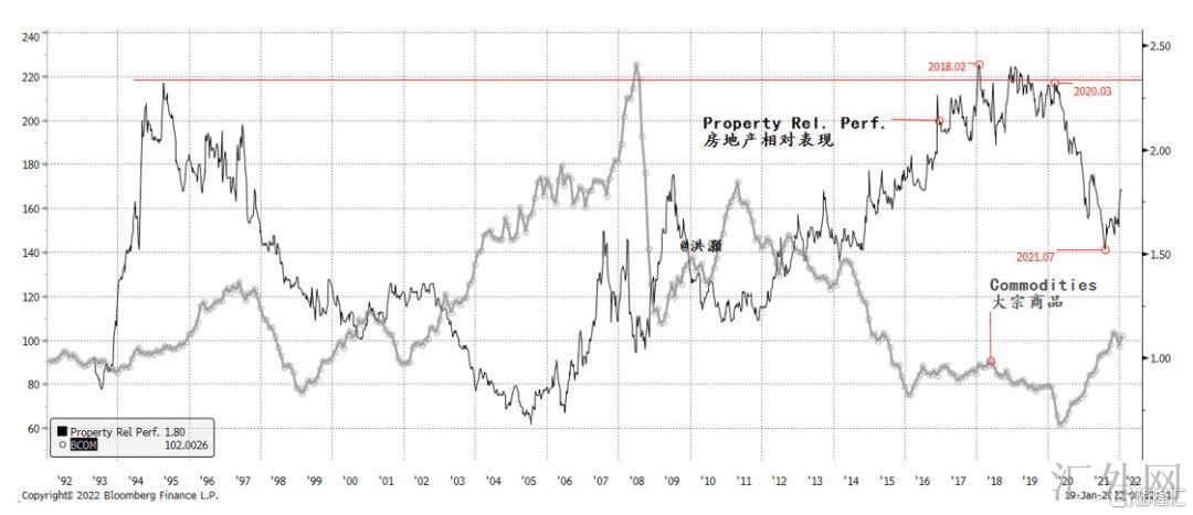 图表1:中国房地产总体利好于2018年2月已刷新其长期趋势的顶点,但从2021年7月迄今一直预计着宽松政策的落地。