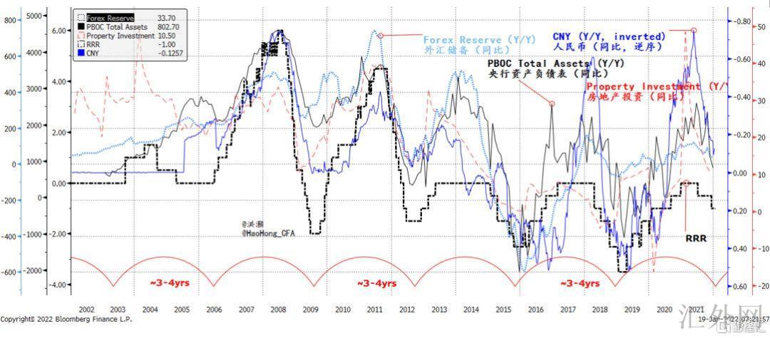我们的中国经济周期理论又一次得到验证。中国的经济短周期时间跨度为每3到4年,而当前正处在最后的减缓阶段(图表3)。在这一阶段,中央银行将向下调整存准和利率,投资增速将跟随而减,外储将到顶而人民币将走弱。我们在题为《前景 2022:夕惕若厉》的前景数据中已细致入微地探讨了我们的经济周期理论对投资的启示。