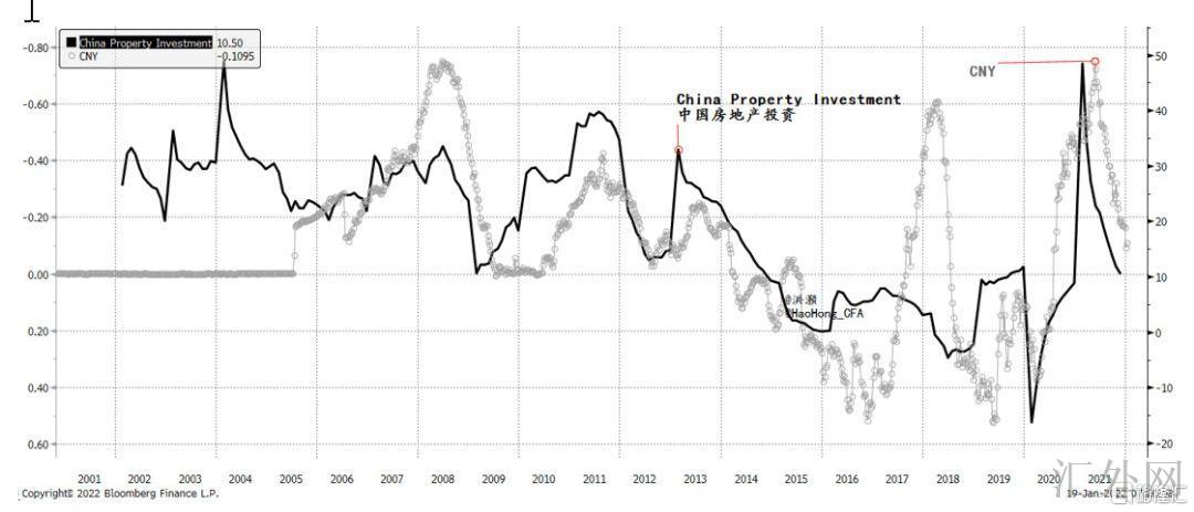 图表2:人民币和下探的房地产投资增速。